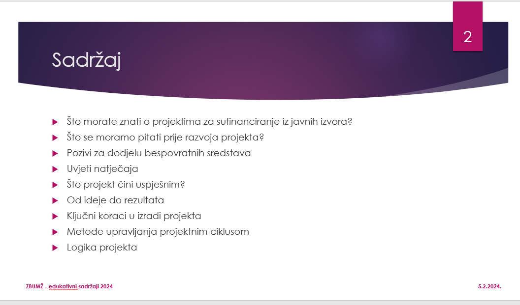 Dana 03. veljače 2024. Zajednica braniteljskih udruga Međimurske županije je pokrenula edukaciju svojih članica za osmišljavanje, izradu i provođenje projekta za opće javno dobro, te izrade izvješća o provedenim projektima.