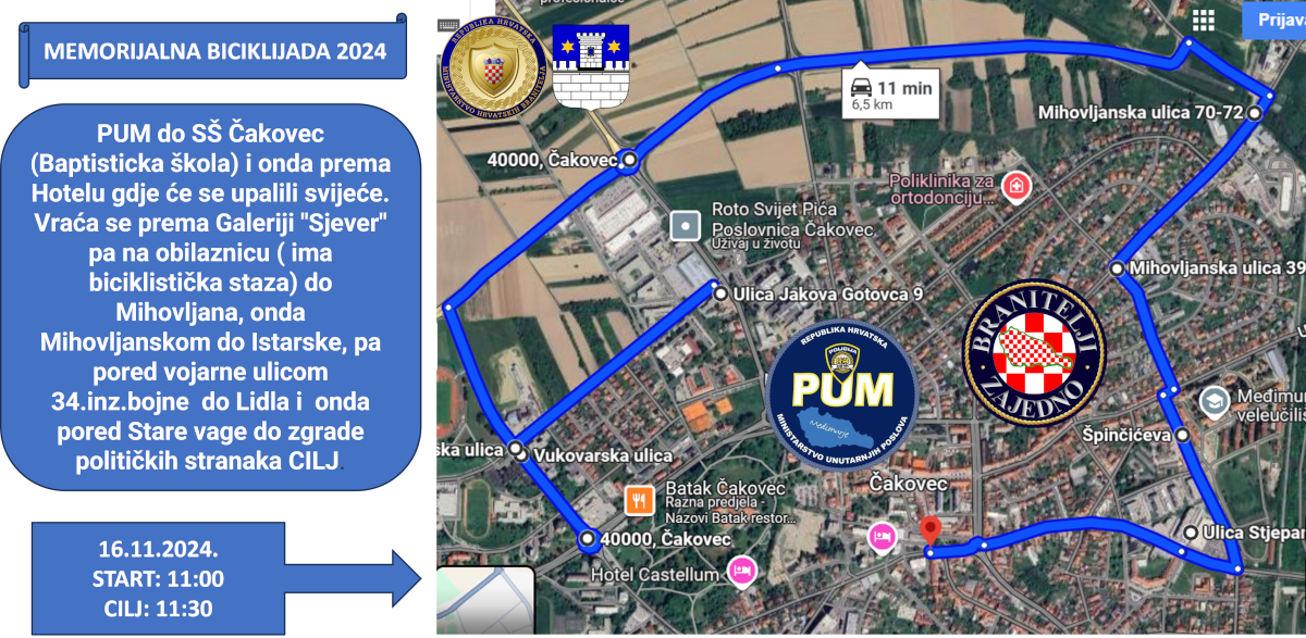 Biciklisti s hrvatskim zastavicama na biciklima u pratnji biciklistice PUM su startali simbolično ispred zagrade PUM, u kojoj je 1991. bilo smješteno Zapovjedništvo HV za Međimurje i Policije i odakle se rukovodilo akcijama oslobođenja Međimurja 1991. godine. Prva stajanka je bila na kružnom toku na početku Vukovarske ulice u Čakovcu, gdje su učesnici biciklijade zapalili 33 svijeće za 33 godine sjećanja na žrtvu Vukovara i Škabrnje. Potom su biciklisti odvezli krug oko Čakovca simbolizirajući zajedništvo Međimuraca u dobru zlu, do bivše vojarne. U sjećanje su kod naziva ulice 34. inženjerijske bojne učesnici biciklijade odali pijetet poginulim i umrlim pripadnicima proslavljene 34. inženjerijske bojne, jedne od tri ratne postrojbe iz Međimurja koje su prošle hrvatska ratišta.